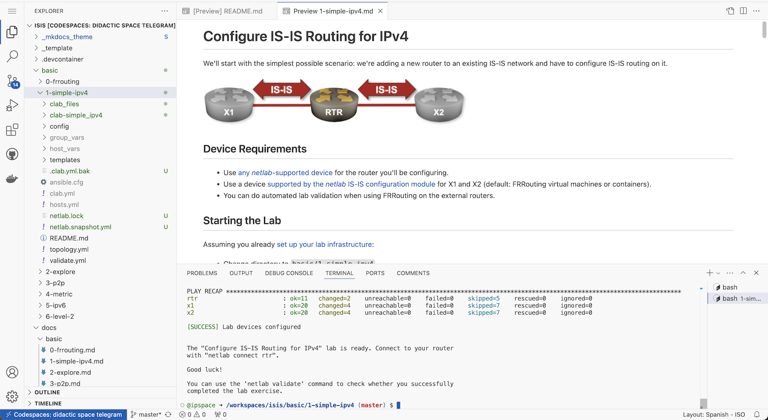 - Connect to your devices with the netlab connect command executed in the Terminal pane.