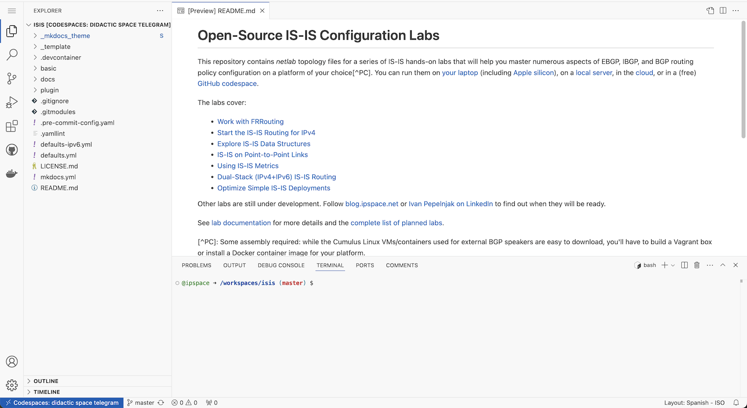 - Unless you’re using GitHub codespaces with VS Code (in which case you know what to do), your codespace opens in a new browser window with three tabs: Explorer (repository folders), Preview (starting with README), and Terminal.